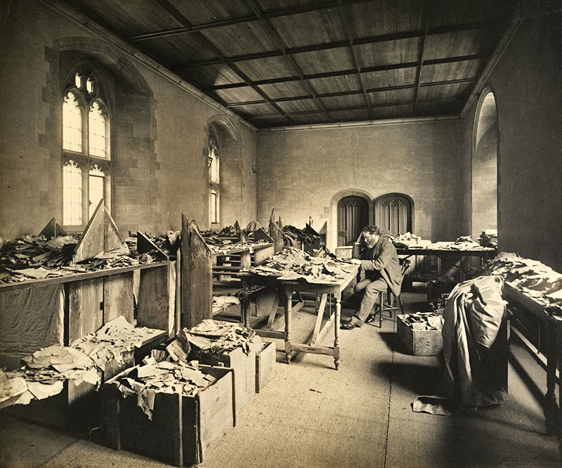 [ Соломон Шехтер в Кембриджі за роботою із пергаментами з генізи синагоги Бен-Езра ]